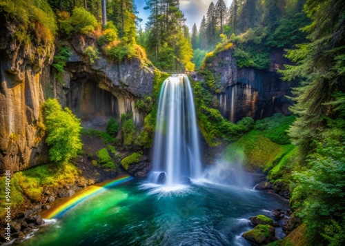 Naklejka premium Toketee Falls after the rain takes on the essence of a shimmering, iridescent peacock's plumage, as the misty veil reveals a kaleidoscope of colors.