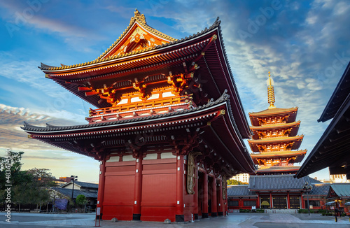Fototapeta premium Tokyo Asakusa. Japan attractions. Asakusa Buddhist temple. Senso-ji in Tokyo. Asakusa temple weather. Travel to Japan. Excursions through streets of Tokyo. Buddhist Japanese landmarks. HOJO-mon gate.