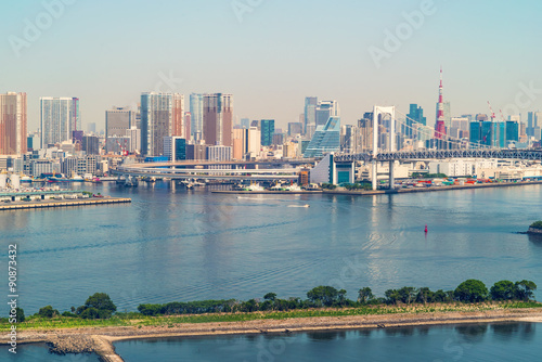 Naklejka premium Tokyo Bay with a view of the Rainbow Bridge and the Tokyo skyline