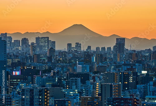 Naklejka premium Tokyo City Skyline with Mount Fuji at Sunset