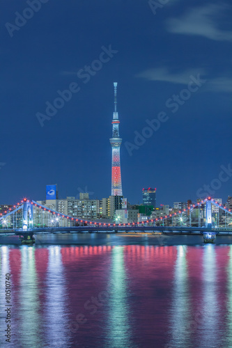 © torsakarin, Obraz premium Tokyo city view with Tokyo sky tree and sumida river at twilight