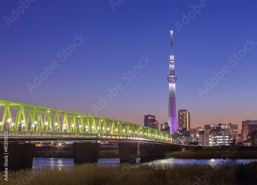 © torsakarin, Obraz premium Tokyo city view with Tokyo sky tree and sumida river at twilight