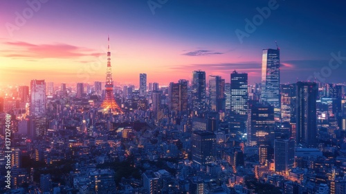 Obraz premium Tokyo Cityscape Aerial View with the Iconic Tower at Sunset