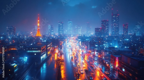 © Ummeya, Fototapeta premium Tokyo Cityscape at Night Rainy Streets Neon Lights and Tower View
