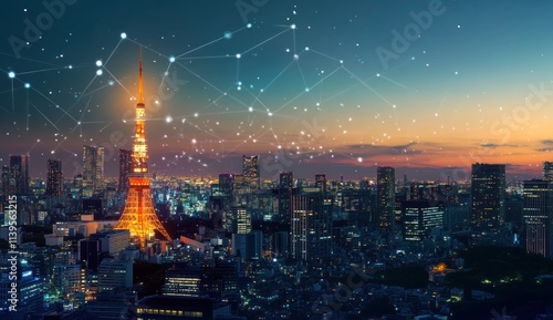 © Alfath, Obraz premium Tokyo cityscape at twilight with network connections.