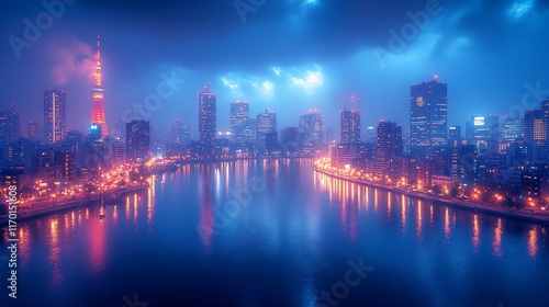 © siyons, Fototapeta premium Tokyo Cityscape Night Lights Reflecting On Water