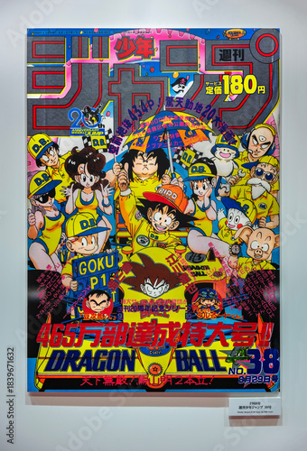 © kuremo, Fototapeta premium tokyo, japan - oct 06 2024: 19th cover of Japanese manga Dragon Ball featured in Weekly Shōnen Jump magazine n38 on August 29, 1988, celebrating 4.65 million copies sold during Japan’s F1 boom era.