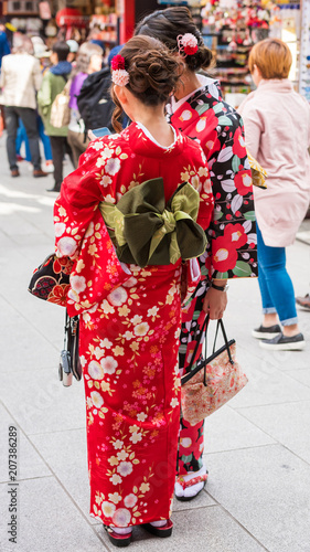© ggfoto, Naklejka premium TOKYO, JAPAN - OCTOBER 31, 2017: The girl in a kimono on a city street. Copy space for text. Vertical.