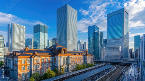 Naklejka premium Tokyo Station: Iconic Landmark in Marunouchi District, Showcasing Architectural Elegance and Bustling City Life