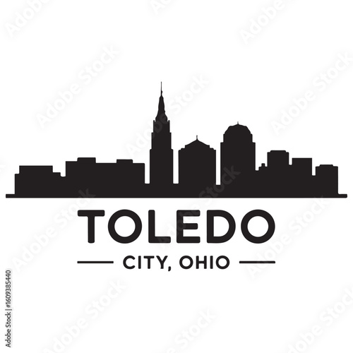 © firoz, Obraz premium Toledo skyline horizontal banner. Toledo City, Ohio. Vector template for your design. Vector black silhouette. with white background