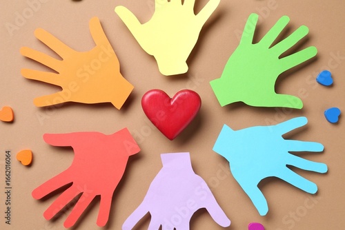 © New Africa, Obraz premium Tolerance concept. Colorful paper hands and hearts on brown background, flat lay