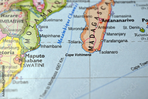 © BlueMistFilmStudios, Naklejka premium Toliara Madagascar Macro World Map Defocused Bokeh Background Close Up Geographic Image