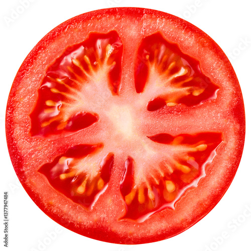 Fototapeta premium Tomato slice isolated png. Tomato round slice on transparent background. Tomato slice png no background. Top view. Full depth of field.