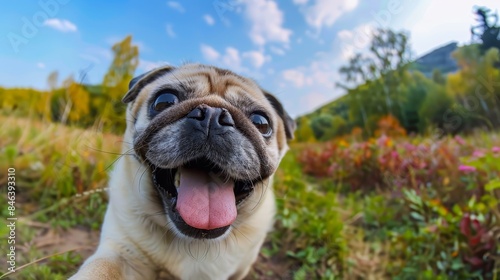 © Viktor, Obraz premium tongue out, mouth open among wildflowers, blue sky, clouds