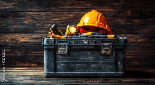 © Olena Roze, Fototapeta premium Toolbox with Hard Hat and Flashlights on Wooden Background. AI generated illustration