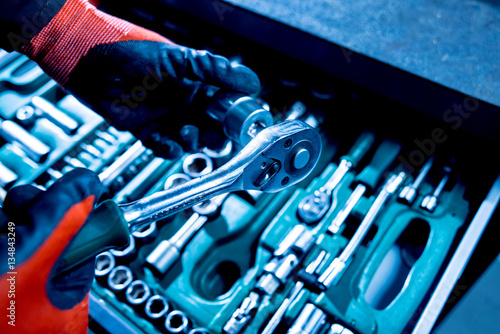 © romaset, Fototapeta premium Tools at the hands. Auto repair