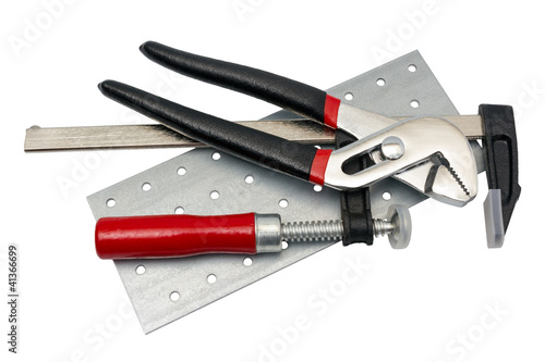 Fototapeta premium Tools collection - Metal adjustable water pliers and carpentry s