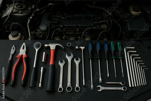Fototapeta premium Tools Organized Neatly on a Workbench Above Car Engine Components