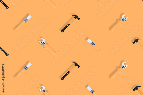 Obraz premium Tools seamless pattern. Tools: construction brushes, hammer, wrench on an orange background.