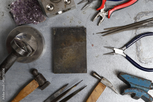 © sergiymolchenko, Fototapeta premium Tools set of jewellery. Jewelry workplace on metal background with copy space for text. Top view.