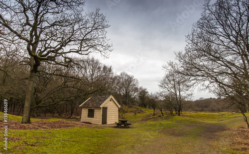 © Sander, Fototapeta premium Toolshed, picnic table and trees in a dune forest meadow
