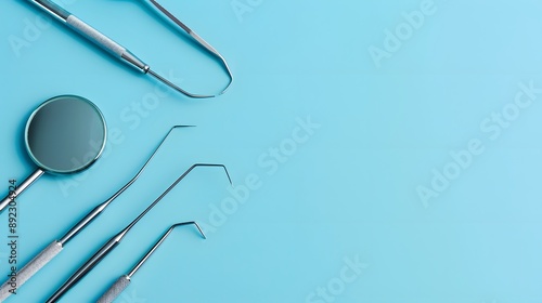 © Farid, Fototapeta premium Tooth and dental instruments on blue background. Dental treatment. Dentist tools mirror, hook, tweezers, syringe. Copy space for text.