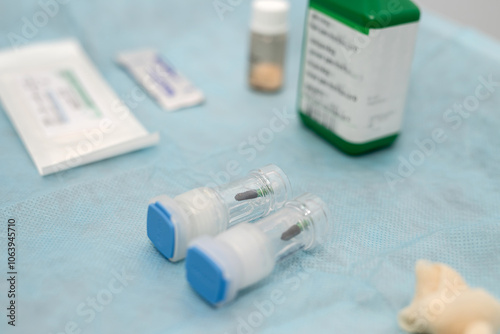 © RomanR, Naklejka premium Tooth human implant in box on dental office. Medical concept