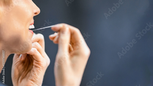 Obraz premium Toothcare. Unrecognizable Woman Flossing And Cleaning Teeth Preventing Cavity...