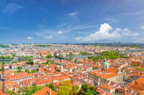Obraz premium Top aerial panoramic view of Prague historical city centre with red tiled...