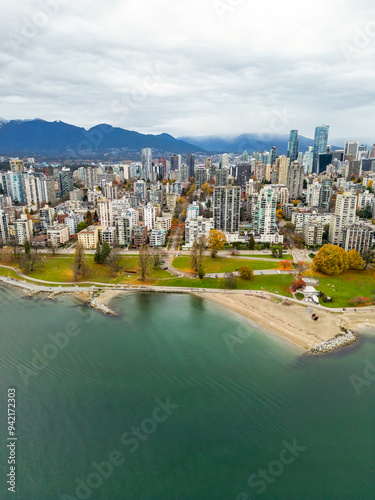 © Pavlo, Obraz premium Top cinematic aerial view. Downtown Vancouver British Columbia. Aerial View Of Skyline Buildings.