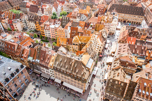 Naklejka premium Top cityscape view on the cathedral square crowded with people in the old town of Strasbourg city, France