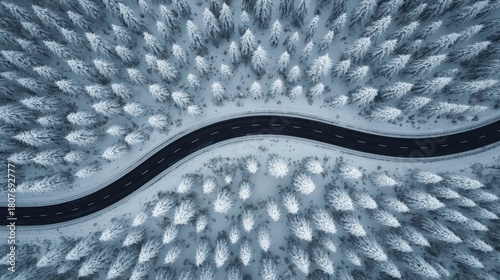 © tsinik, Naklejka premium Top down aerial view of a black winding road surrounded by snow-covered pine trees in a winter forest. Cold season landscape.