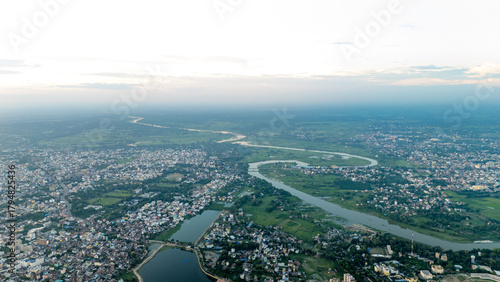 © Shantanu, Obraz premium Top down Buildings and Apartment with Multiple Building aerial. Urban Buildings and Apartment at bridge road at Delhi. Cinematic cityscape drone shot. Noida Buildings.