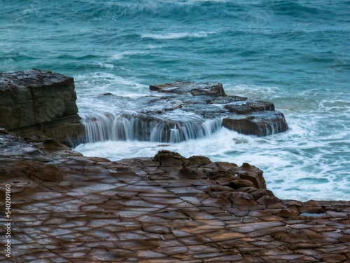 © Merrillie, Fototapeta premium Top down seascape, water cascades and rock platform