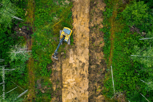 Naklejka premium Top down shot of excavator digging up material through forest for new...