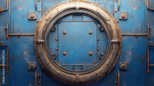© Shelley, Naklejka premium Top-down view of a round, blue steel door in an industrial steampunk spaceship. Photorealistic, cinematic concept art with detailed metal textures and futuristic design elements.