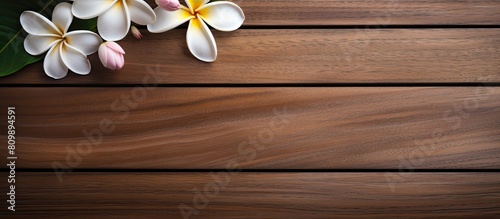 © HN Works, Naklejka premium Top down view of a spa environment featuring a plumeria flower gracefully placed on a wooden table creating an inviting copy space image