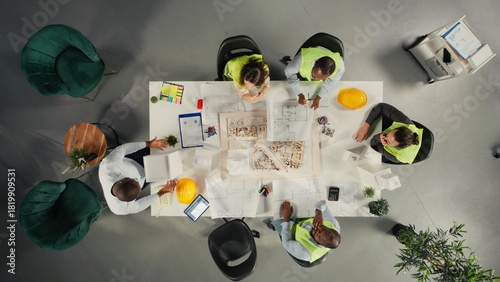 © DC Studio, Obraz premium Top down view of property developers and architects in meeting reviewing blueprints and structural designs. Team discusses project approval and city planning for housing growth.