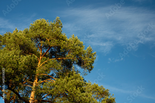 © Alex Barera, Fototapeta premium Top of a pine tree against a blue sky. View of pine and clear sky on a sunny day