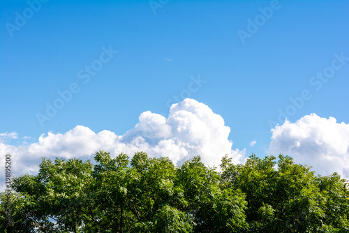 Obraz premium Top of green tree, beautiful blue sky, white clouds on horizon with copy space