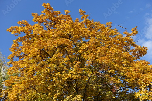 Fototapeta premium Top of Norway maple tree with autumnal foliage against blue sky in October