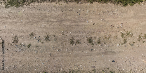 Fototapeta premium top panorama view from above on surface of gravel road with car tire tracks