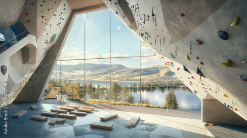 © Eva, Fototapeta premium top view, a big modern climbing center gym, concret facade, hiking trails on the roof, large window, mountain style, lake, midday, summer, hills