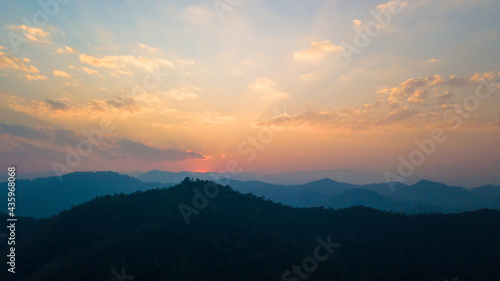 © oopsurasak, Fototapeta premium Top view aerial photo from flying drone of landscape with farmland Chiang Mai, Thailand