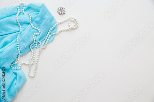 Fototapeta premium Top view Blue fabric fashion and pearl