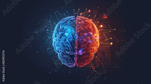 © EnricaDjango, Fototapeta premium Top view brain split into two distinct halves: one half vividly depicting human neural textures and features, representing creativity and emotion; the other half designed with a digital, circuit-like