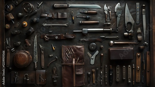 © Prapanista, Fototapeta premium top view collection set An organized display of various vintage tools and equipment on a dark wooden surface.