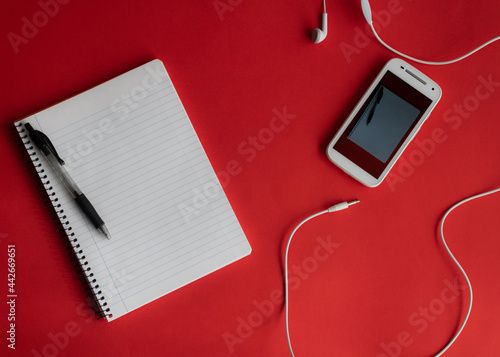 Fototapeta premium Top view desk. Red Background office desk table with notepad and smartphone