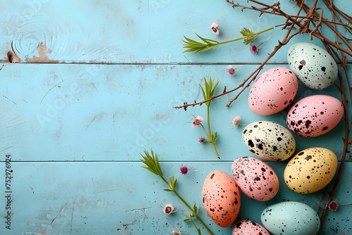 Obraz premium top view easter egg composition with small flowers and twigs on wooden rustic surface in pastel blue colors