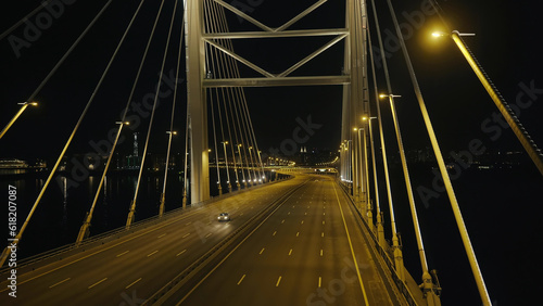 Fototapeta premium Top view elements metal structure modern cable stayed car bridge in night city